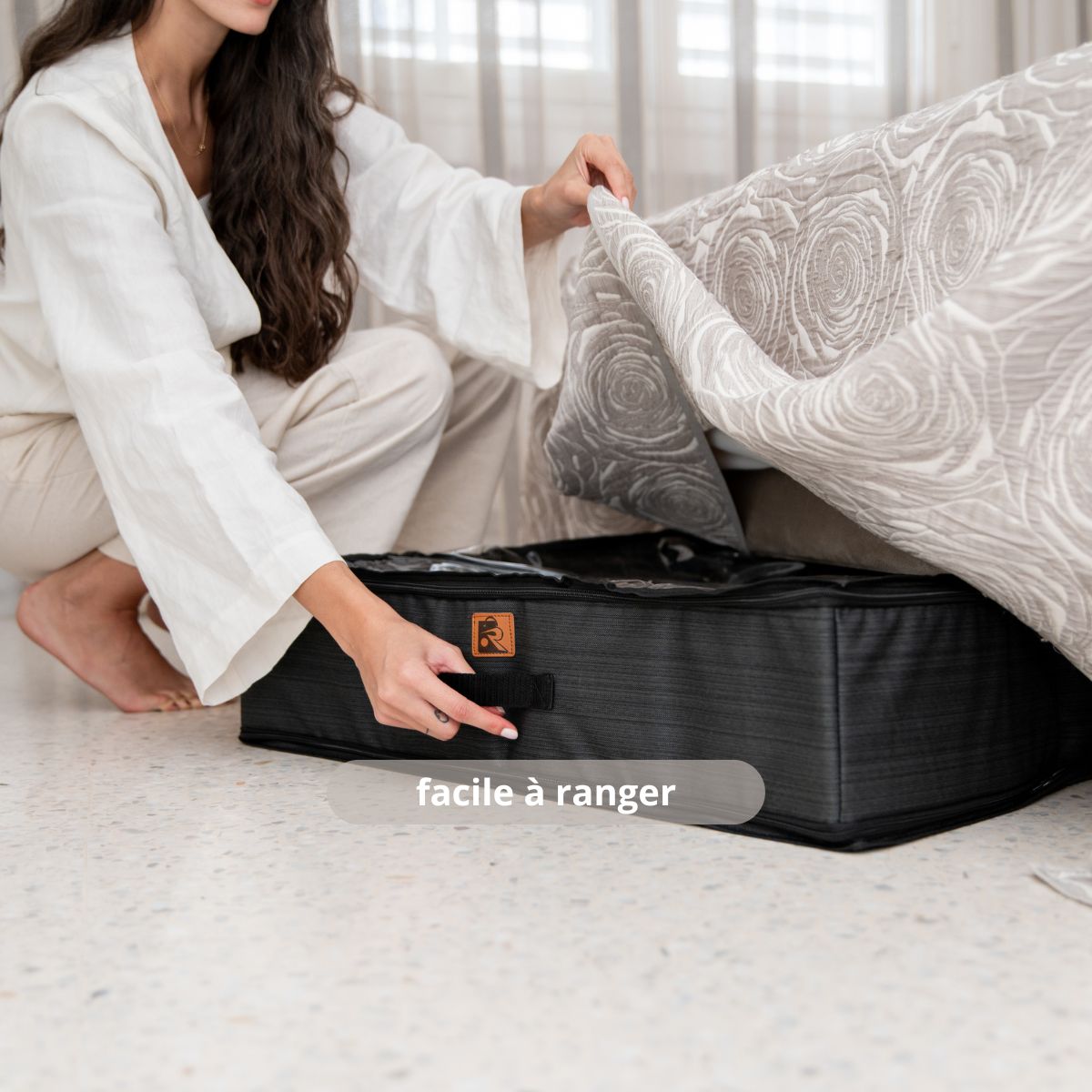 Son design compact (75x60x15cm) s’intègre facilement dans une chambre, un placard ou sous un lit.