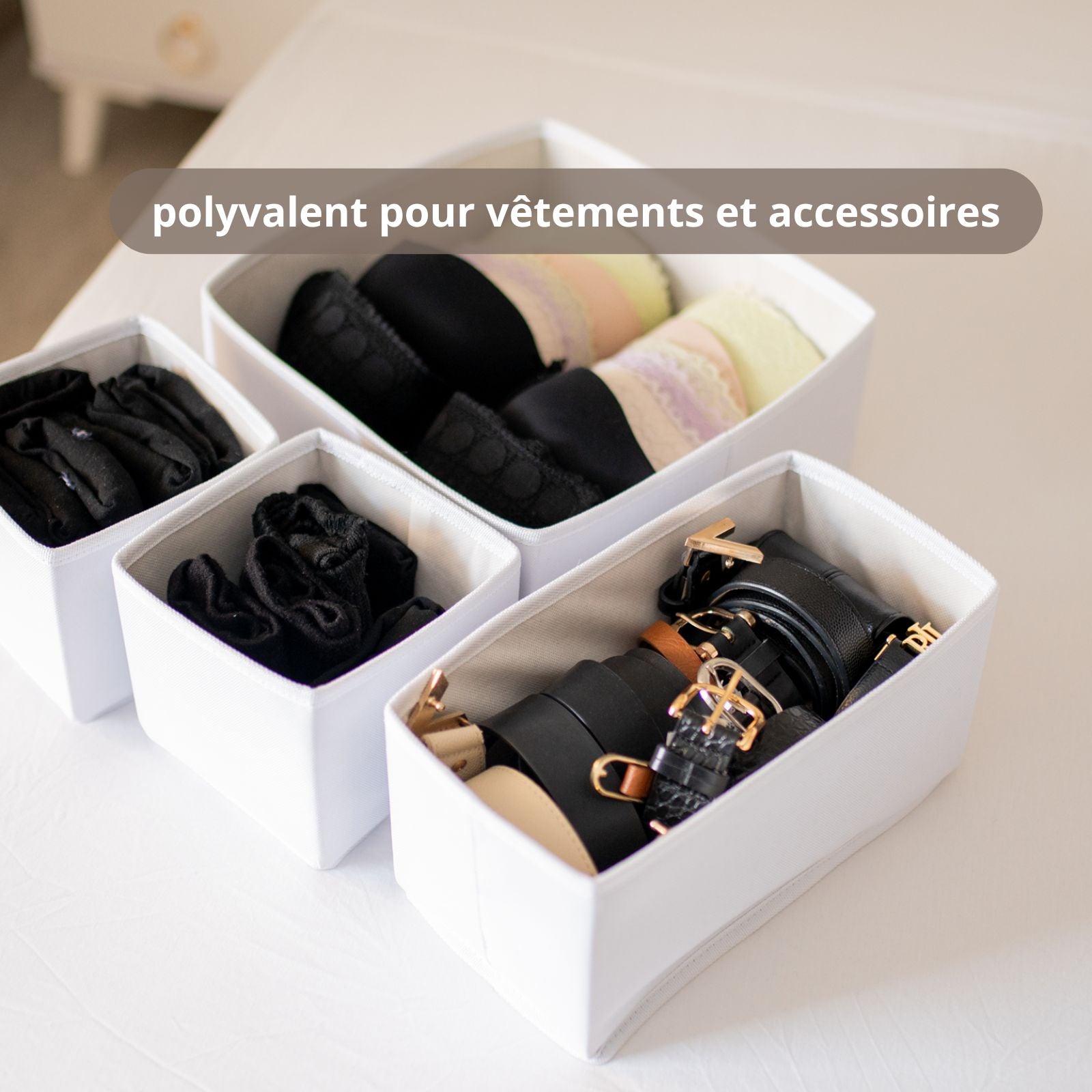 Optimisez votre rangement avec ce set de 4 organiseurs de tiroirs, idéal pour les sous-vêtements, chaussettes, ceintures et accessoires. Son design rigide et pliable assure un maintien parfait tout en offrant une solution gain de place.